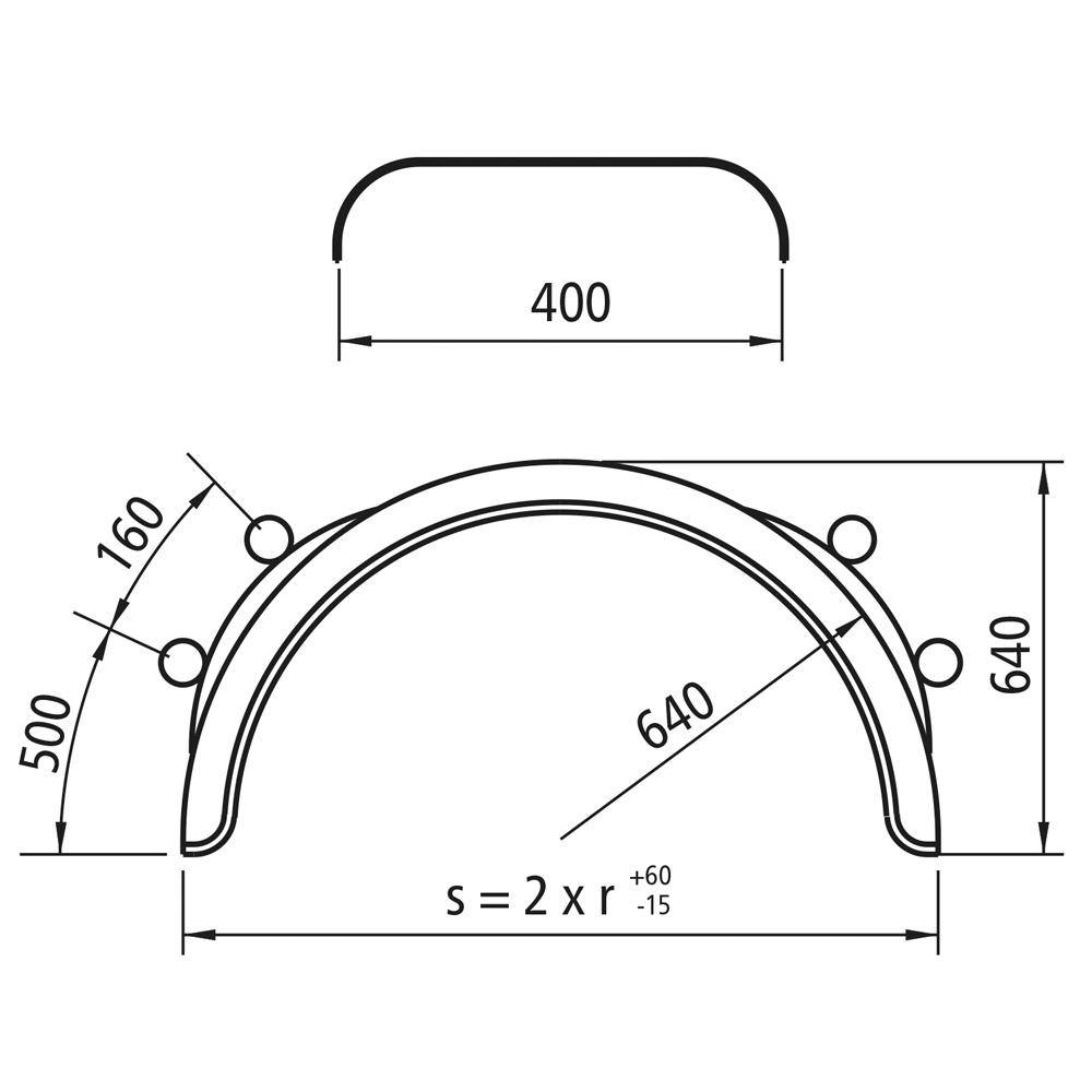 Podstawowe wymiary błotnika: Typ: 1/2, Szerokość [mm]: 400, Promień [mm]: 640, Obwód [m]: 2000, Długość [mm]: 1280,
