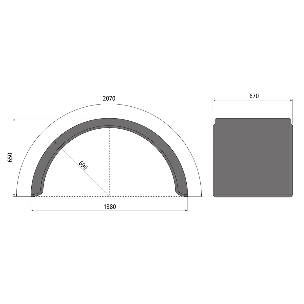 Podstawowe wymiary błotnika: Typ: 1/2, Szerokość [mm]: 670, Promień [mm]: 690, Obwód [m]: 2070, Długość [mm]: 1380,